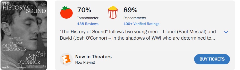 ‘A História do Som’ (The History of Sound), romance estrelado por Paul Mescal (‘Gladiador 2’) e Josh O’Connor (‘Rivais’), já está em cartaz nos cinemas nacionais. No Rotten Tomatoes, o longa conquistou 70% de aprovação da crítica especializada, com base em 138 análises, além de 89% de aprovação do público.