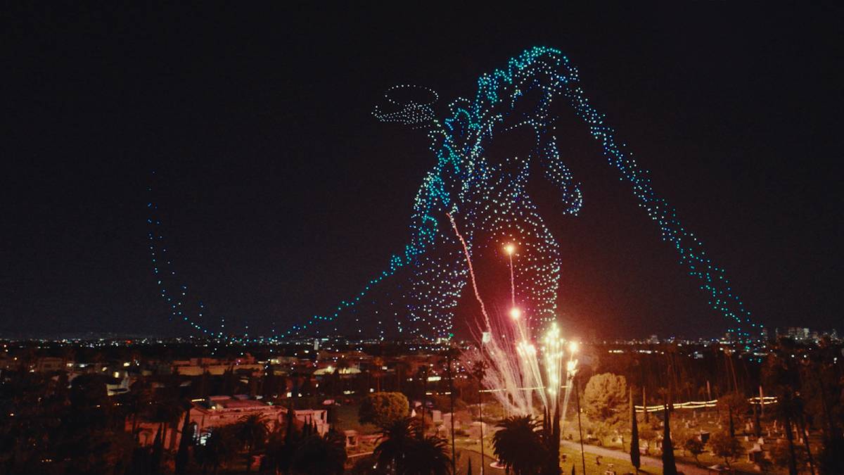 Embora shows de drones geralmente sejam vistos como apenas um espetáculo no céu, essa produção de 12 minutos interage com a paisagem de Hollywood para posicionar Godzilla, Kong e o recém-introduzido Titan X no cenário urbano, dando a sensação de que