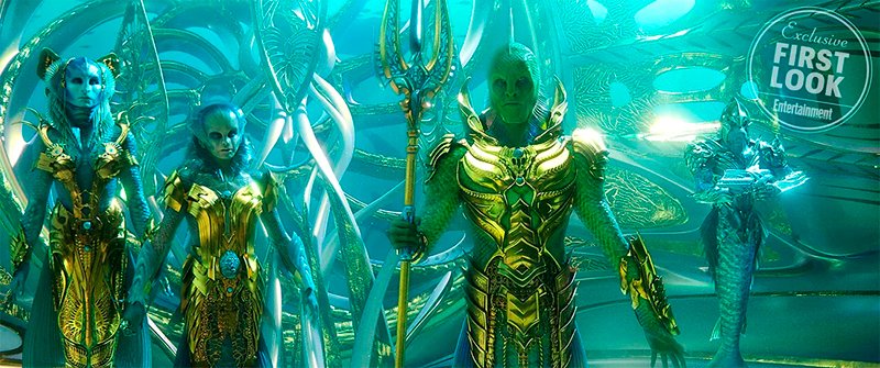 Na cena da foto abaixo, o rei Orm (Patrick Wilson, não mostrado) procurou o Rei Pescador (interpretado por Djimon Hounsou, com o tridente) para pedir sua ajuda para declarar guerra nos oceanos, pois estão poluindo o mundo na superfície. Há também a Rainha dos Pescadores (Natalia Safran) e a Princesa (Sophia Forrest) à esquerda, e um guarda real à direita.