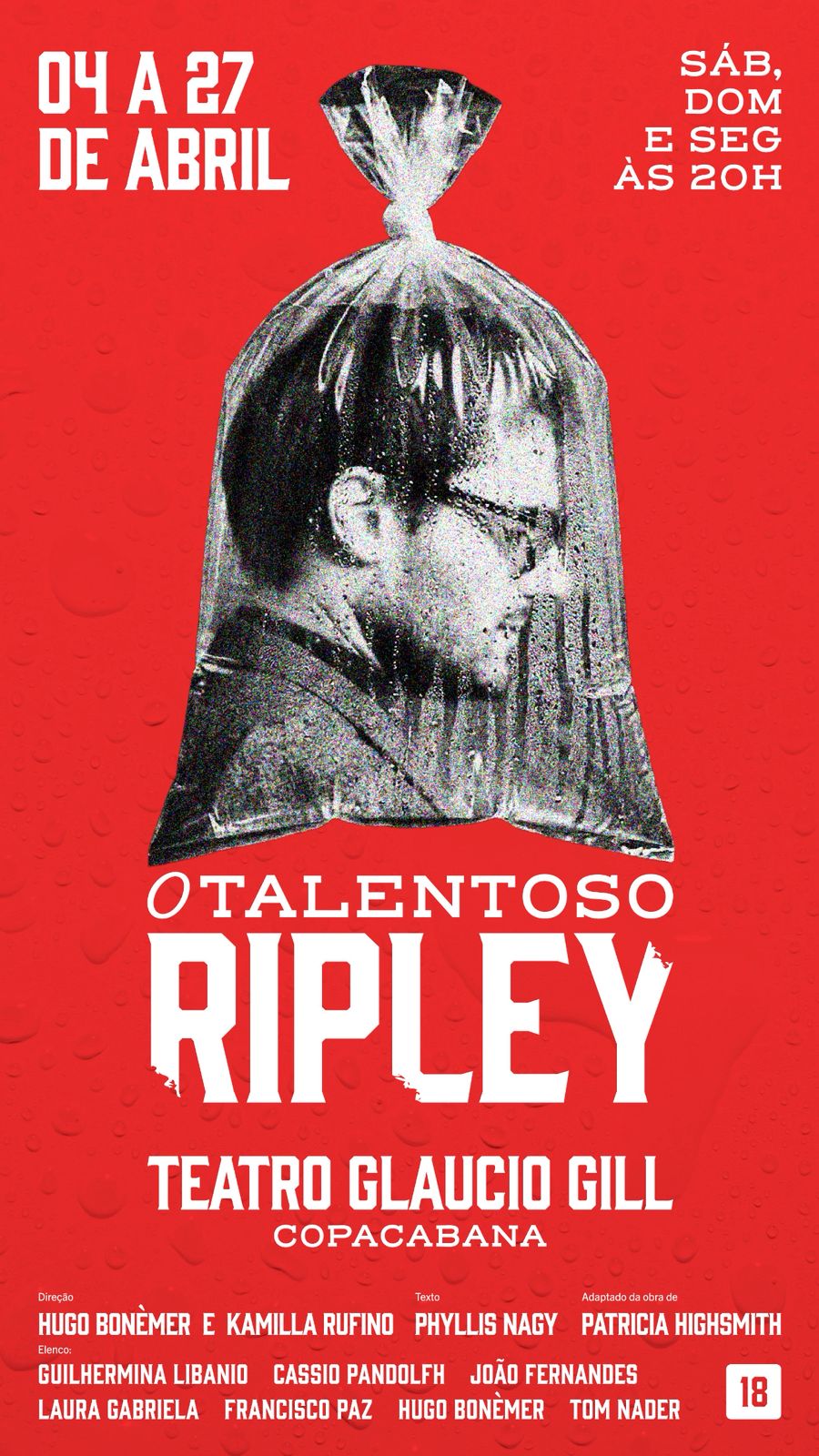 A partir de 4 de abril, o Teatro Gláucio Gill, em Copacabana, no Rio de Janeiro, recebe a estreia da versão brasileira de ‘O Talentoso Ripley’, primeira adaptação teatral em português do romance de Patricia Highsmith, publicado em 1955.