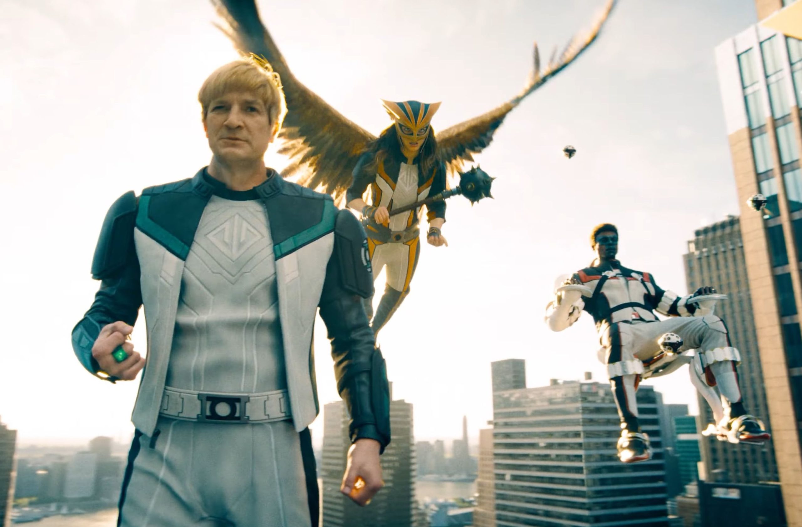 O mesmo vale par Edi Gathegi. É bem provável que o seu Senhor Incrível conquiste um fandom que ele nunca teve. Completamente excêntrico, o herói tem algumas das sequências de ação visualmente mais interessantes, além de se conectar com outros personagens de forma excêntrica. Ele é muito sóbrio, e sua seriedade, às vezes, parece arrogância. Ainda assim, ele está ali para ajudar quem precisar e quando precisar. Quem acaba sobrando um pouco é a Mulher-Gavião de Isabela Merced. Ela é menos desenvolvida como personagem, mas ganha boas cenas de ação. E seus ataques acompanhados dos gritos de gavião são ótimos. Ela foge a esse realismo, fazendo o público lembrar que são heróis de quadrinhos, que tudo ali é possível.