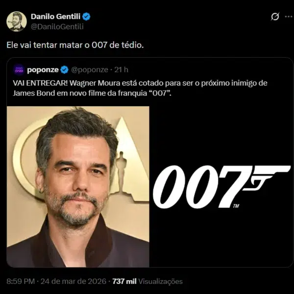 A internet brasileira entrou em ebulição após rumores apontarem o astro Wagner Moura como um dos nomes cotados para interpretar o vilão do próximo filme da franquia James Bond. Sempre irreverente, o apresentador e humorista Danilo Gentili debochou da possível escalação do ator brasileiro indicado ao Oscar de Melhor Ator por ‘O Agente Secreto‘ e postou:
