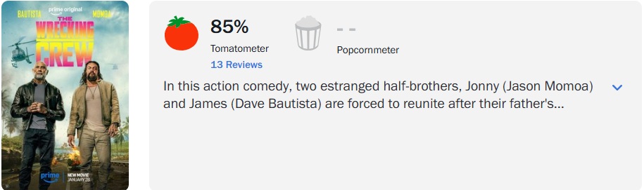 ‘Dupla Perigosa’ (The Wrecking Crew), novo filme de ação estrelado por Jason Momoa (‘Aquaman’) e Dave Bautista (‘Guardiões da Galáxia’), alcançou 85% de aprovação, no Rotten Tomatoes, baseado em 13 avaliações.