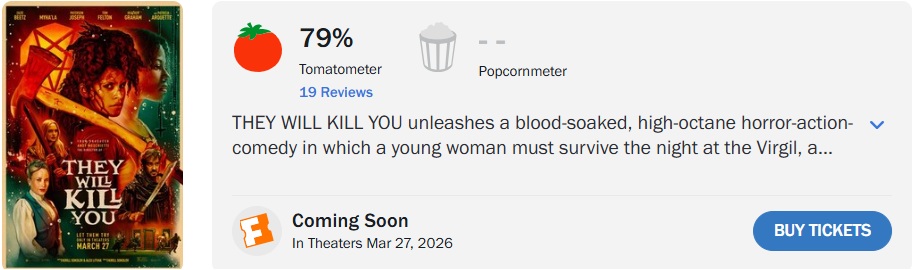 ‘Eles Vão Te Matar’ (They Will Kill You), terror produzido por Andy Muschietti, conhecido por ‘It: A Coisa’, e estrelado por Zazie Beetz, conquistou 79% de aprovação no Rotten Tomatoes, com base em 19 avaliações.