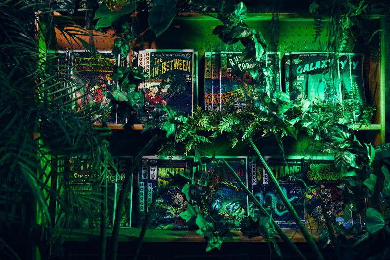 • Ultra-Violent Comics, quadrinhos criados para o Halloween Horror Nights, forram uma prateleira na entrada da Seeds of Extinction. Cada capa é baseada em uma casa assombrada ou personagem de eventos passados.