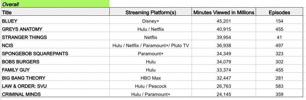 Em segundo lugar, o drama médico ‘Grey’s Anatomy’ registrou 40,9 bilhões de minutos assistidos (via Hulu e Netflix). Com 455 episódios de longa duração, a série reforça a tendência de títulos licenciados com grandes bibliotecas dominando a audiência.