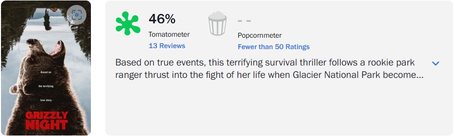 ‘Grizzly Night’, terror baseado em fatos reais sobre um ataque de ursos, conquistou 46% de aprovação no Rotten Tomatoes, com base em 13 avaliações da crítica especializada.