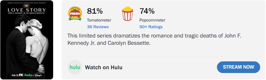 ‘História de Amor: John F. Kennedy Jr. e Carolyn Bessette’, nova série antológica criada por Ryan Murphy, conquistou 81% de aprovação da crítica, com base em 36 avaliações, além de 74% de aprovação do público.