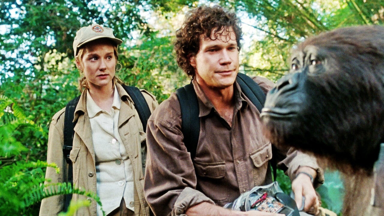 O elenco reuniu nomes como Laura Linney, então em ascensão, Dylan Walsh, Ernie Hudson (de ‘Os Caça-Fantasmas‘), Tim Curry em modo histriônico como um explorador com sotaque duvidoso, além de Grant Heslov e Joe Don Baker. Ah, e é claro, uma gorila chamada Amy, interpretada por uma atriz fantasiada e animatrônicos de última geração, projetados por Stan Winston — o mesmo gênio por trás dos dinossauros de ‘Jurassic Park‘.
