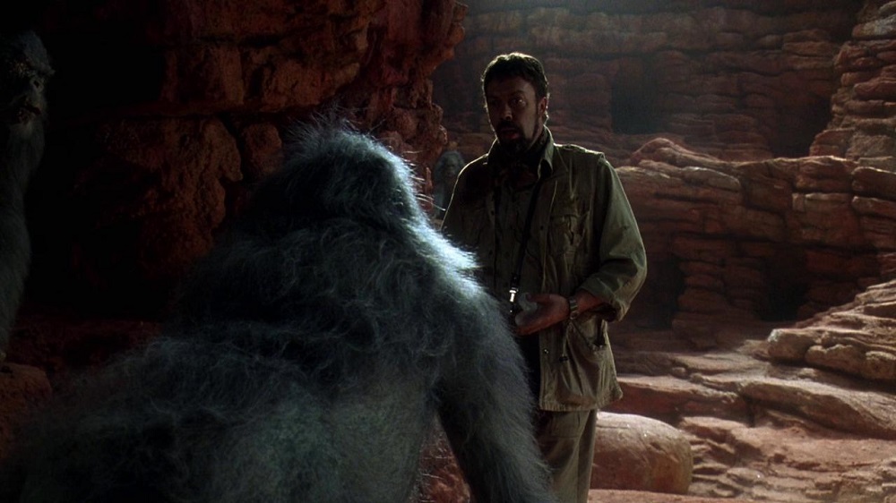 Ainda que ‘Congo‘ compartilhasse o DNA de ‘Jurassic Park‘ — tecnologia futurista, expedições perigosas, cientistas em apuros e criaturas mortais —, a diferença aqui estava no tom. Onde Spielberg apostava no assombro e na maravilha, ‘Congo‘ mergulhava de cabeça na aventura pulp, evocando filmes de safári e os seriados no cinema dos anos 40 e 50, com direito a vulcões em erupção, selvas traiçoeiras, civilizações perdidas e macacos hostis que pareciam saídos de um pesadelo. Combinava-se um enredo de ficção científica com uma estética que flertava com o exagero — algo que dividiu opiniões, para dizer no mínimo.