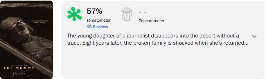 ‘Maldição da Múmia’, novo longa da clássica franquia, desta vez comandado por Lee Cronin (‘A Morte do Demônio: A Ascensão’), teve uma estreia mediana no Rotten Tomatoes, alcançando 57% de aprovação com base nas primeiras 65 avaliações.