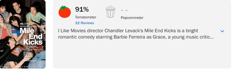 ‘Mile End Kicks’, nova comédia romântica estrelada por Barbie Ferreira (‘Euphoria’), conquistou recepção positiva no Rotten Tomatoes, alcançando 91% de aprovação da crítica especializada com base em 22 avaliações.