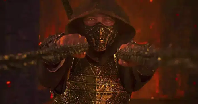 No material, vemos Scorpion (Hiroyuki Sanada) lançando suas kunais, dardos de corda, em seu oponente (possivelmente Noob Saibot, interpretado por Joe Taslim), arrastando-o para frente e cortando-o ao meio – finalizando-o em um grotesco e poderoso fatality.