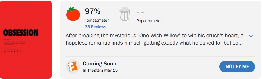 ‘Obsession’, novo terror da Blumhouse Productions estrelado por Michael Johnston (‘Maestro’) e Inde Navarrette (‘Superman & Lois’), teve uma estreia promissora no Rotten Tomatoes. O longa conquistou 97% de aprovação da crítica, com base em 35 avaliações.