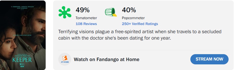 ‘Para Sempre Medo’ (Keeper), novo filme do diretor Osgood Perkins (‘Longlegs – Vínculo Mortal’), conquistou 49% de aprovação da crítica especializada, com base em 108 avaliações, além de 40% de aprovação por parte do público.