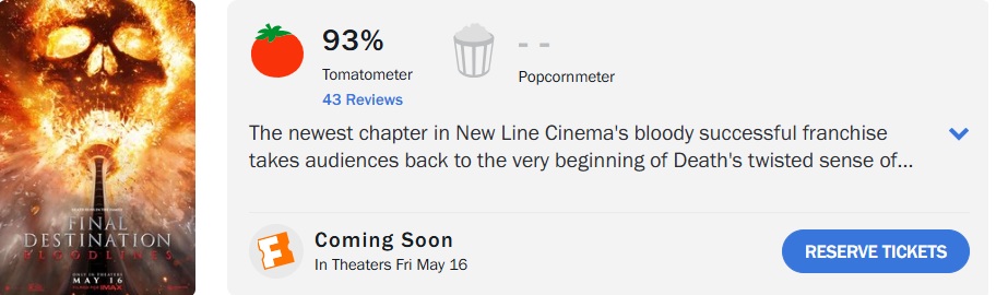 ‘Premonição 6: Laços de Sangue’, sequência da clássica franquia de terror, conquistou uma avaliação positiva no Rotten Tomatoes, com 93% de aprovação, baseada em 43 análises.