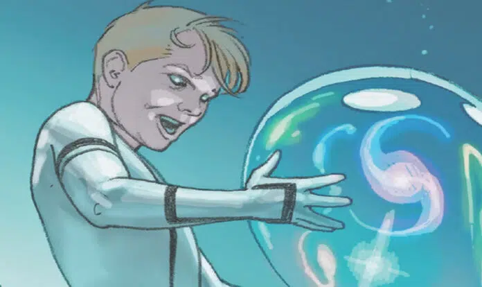 Para quem não está familiarizado, Franklin Richards é o filho de Reed Richards/Sr. Fantástico e Sue Storm/Mulher Invisível. Na história, ele possui poderes mutantes extremamente poderosos, tais como manipulação da realidade e telecinese.