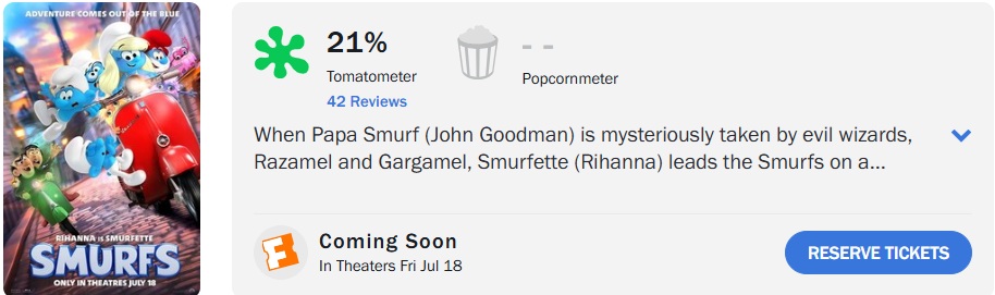 ‘Smurfs’, novo longa da aclamada franquia animada, estreia hoje nos cinemas, mas faz estreia desastrosa no Rotten Tomatoes, alcançando apenas 21% de aprovação, com base em 42 avaliações.