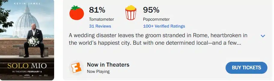 A nova comédia romântica estrelada por Kevin James, ‘Solo Mio’, alcançou 81% de aprovação da crítica especializada, com base em 31 avaliações, além de impressionantes 95% de aprovação do público.
