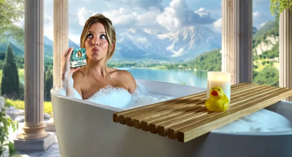 Segundo o comunicado da marca, o produto “canaliza dois dos melhores lugares da Terra: a natureza selvagem e a banheira de Sydney Sweeney”.