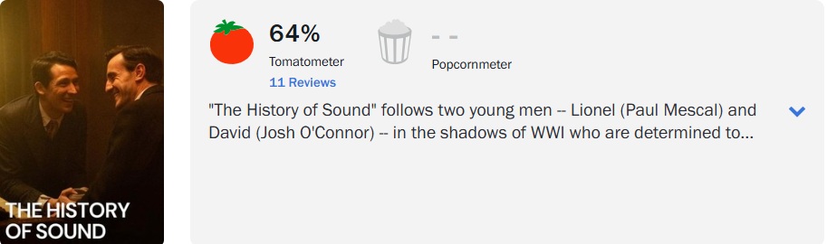 ‘The History of Sound’, romance LGBT estrelado por Paul Mescal e Josh O’Connor, obteve uma aprovação mediana no Rotten Tomatoes, com 64% de aprovação com base em 11 análises.