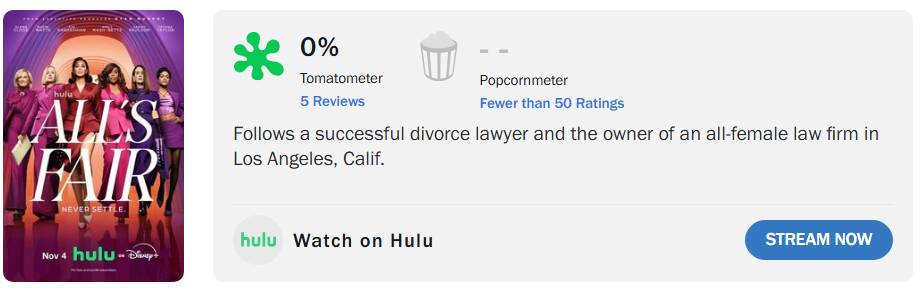 Com 5 reviews publicadas até o momento, a série ‘Tudo é Justo‘ (All’s Fair), nova produção do Ryan Murphy (‘American Horror Story’), amargou 0% de aprovação dos críticos no Rotten Tomatoes.