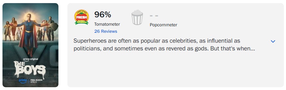 Com 26 reviews publicadas até o momento, a 5ª (e última) temporada de ‘The Boys‘ abriu com impressionantes 96% de aprovação dos críticos no Rotten Tomatoes.
