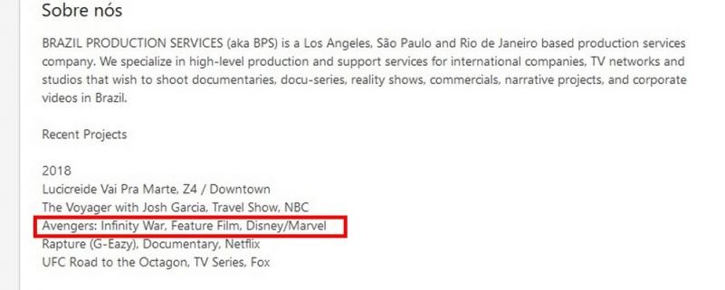 A produtora BPS (Brazil Production Services), de Thiago Costa, anunciou em seu perfil que filmou cenas de ‘Vingadores: Guerra Infinita‘ no Brasil. Não foi revelado a extensão das cenas e as locações, mas especula-se que serão cenas de destruição causadas por Thanos.